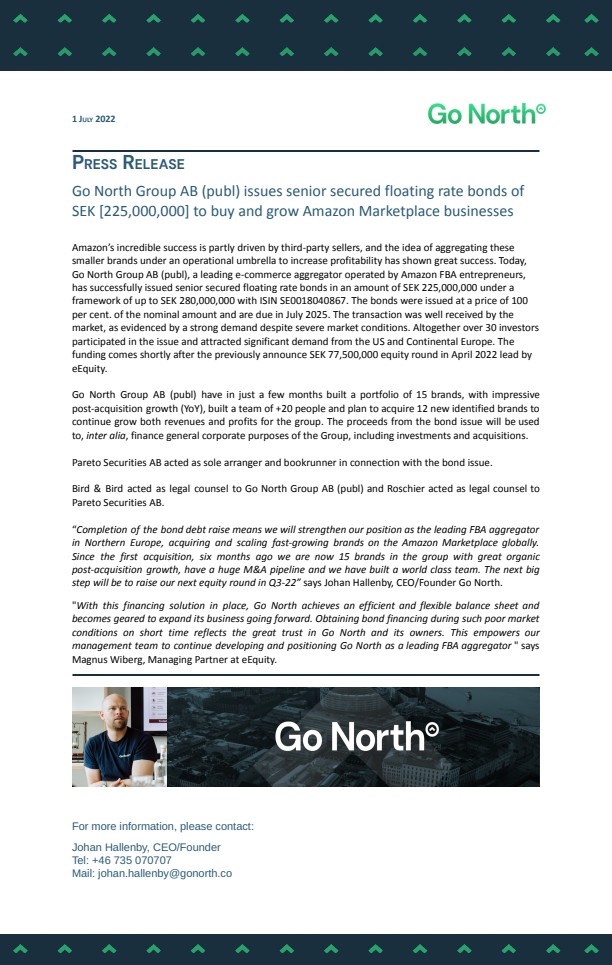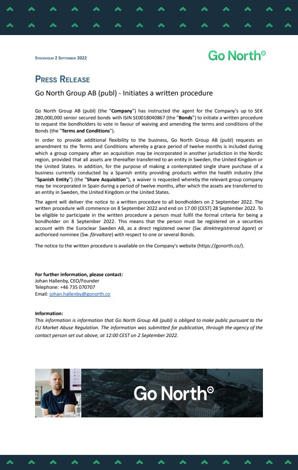 Learn moreGo North Group AB (publ) (the "Company") has instructed the agen…